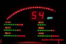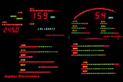 All sets of the K200-series include one voicebox and two dummy displays to be installed under the TV area. Graphic overlays are not included. Two versions to choose from The complete set of electronics for the 2-TV dash can be ordered with a functional vacuum fluorescent message center for US$1370, plus shipping. A lower price version is also offered with a permanent (static) LED message display, for US$995 plus shipping. The K263 voicebox is included but can also be ordered separately, for US$179 plus $8 shipping (US location). For more information, check the voicebox page. Other boards are not available separately. New! February 2004 - Hidden Features Revealed Owners of the K200 and K201 sets of electronics will be delighted to find out that their sets have additional built-in features which were only waiting to be discovered. 1. The upper left section of the speedometer display board features 4 light bars which can be wired to any signal, such as turn signals, check engine or other information lights. 2. The scrolling bar on the telltale display can be powered separately. One possible use of this feature is to interconnect this display with a car alarm system and have only the scrolling bar activated while the car is parked and armed. 3. The tachometer display features two additional fully functional bar graph meters. The two bonus meters can be used to monitor intake air temperature, manifold air pressure or the throttle position sensor. More details about the extra features are provided in the installation instructions, supplied with every set of electronics. If you purchased a set of electronics from us and do not have the installation instructions, please contact us. Additional Information All required sensors and signals should be already available on any Trans Am; basic Firebirds without the complete instruments cluster might require the purchase and the installation of extra sensors. All board assemblies feature a stacked design, as introduced in 1999 on the K400-series, where the driver electronics is mounted on the back of each display board. This eliminates the need for flat cables, facilitates installation and improves reliability. Each board assembly is completely independent. Terminal blocks are provided on each driver board for power and sensor input connections. Printed circuit boards meet military specification MIL-P-13949F. Custom LED colors are available. Please inquire for details. You will find more pictures of the K200-series on the next page. For more information, write to sales@jupitere.com.